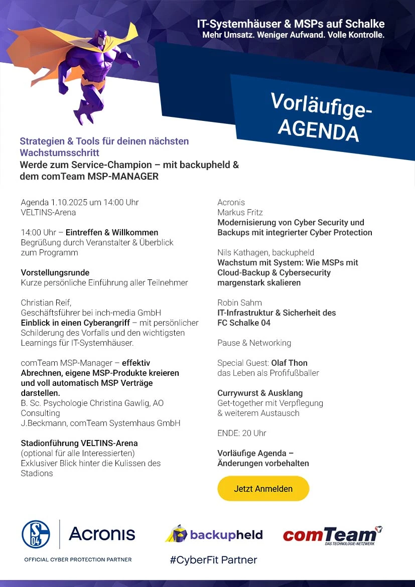 Den neuen comTeam MSP-MANAGER – dein zentrales Tool für die einfache Verwaltung und zuverlässige Abrechnung von Managed Services. In einer Live-Demo erhältst du konkrete Einblicke, wie du mit dem comTeamMSP-MANAGER in Kombination mit dem Abrechnungsworkflow von Acronis deine Serviceprozesse effizient strukturieren, automatisieren und zuverlässig abrechnen kannst.